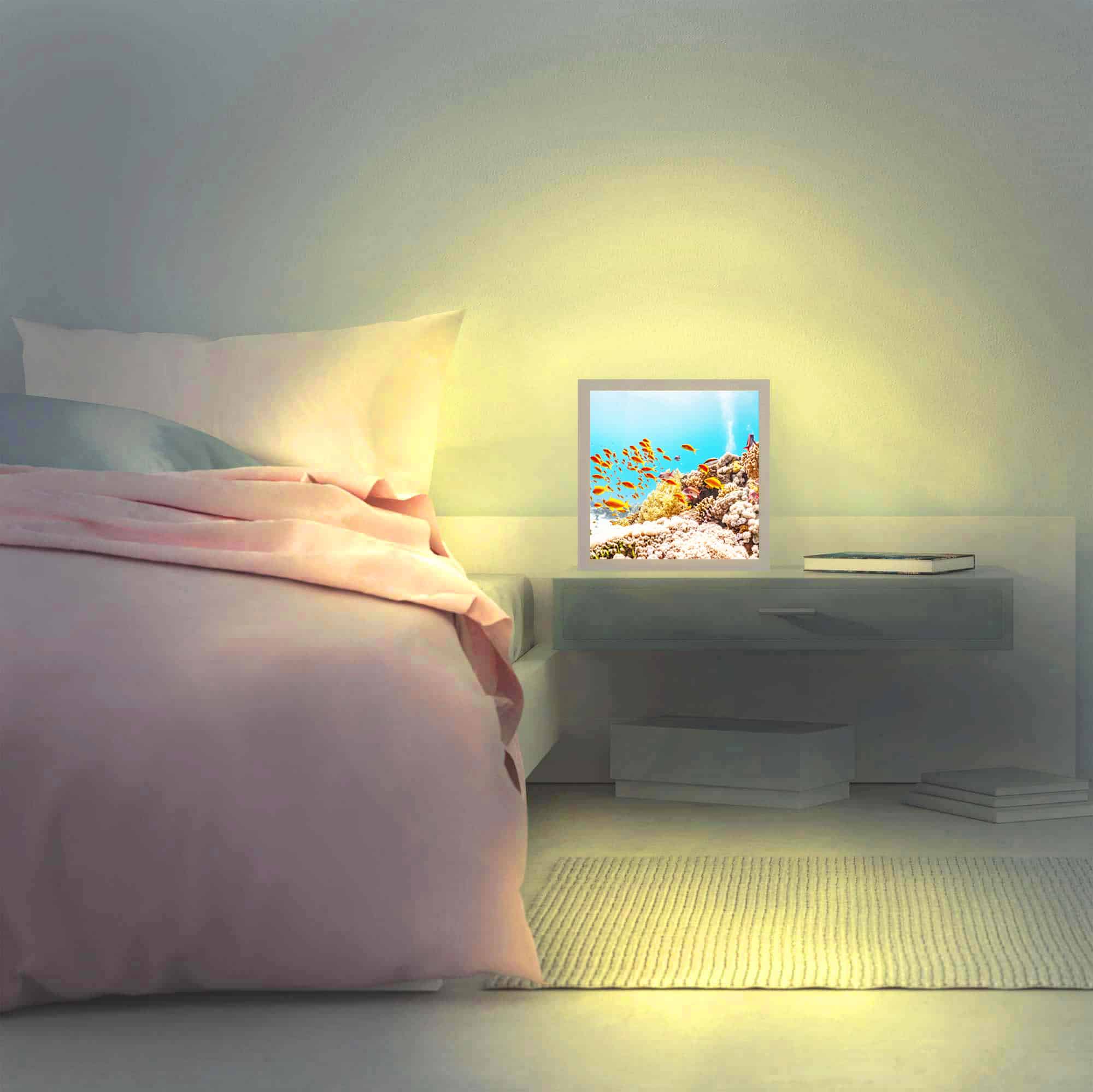 Choisissez le format, la forme et le visuel pour complètement personnaliser votre lampe de chevet désignée sous forme de cadre LED.