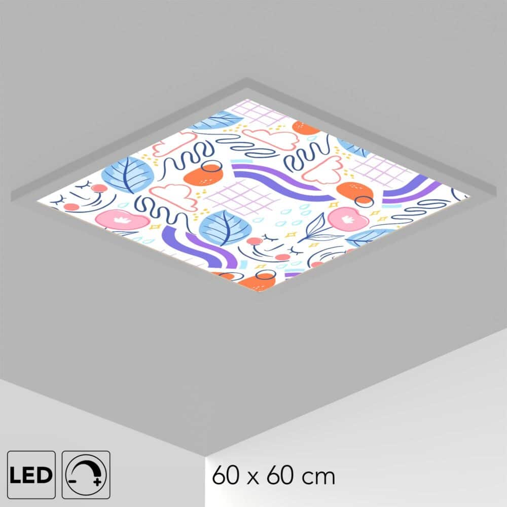 Le plafonnier comprend le panneau LED personnalisé avec le visuel, une alimentation et en option un interrupteur mural-variateur pour régler l’intensité de la lumière dans la chambre de votre enfant.