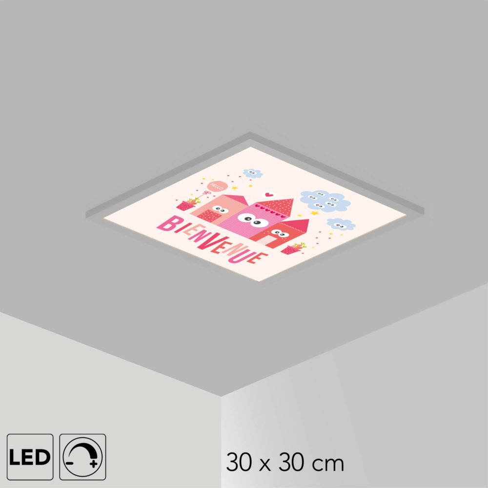 Le plafonnier comprend le panneau LED personnalisé avec le visuel, une alimentation et en option un interrupteur mural-variateur pour régler l’intensité de la lumière dans la chambre de votre enfant.