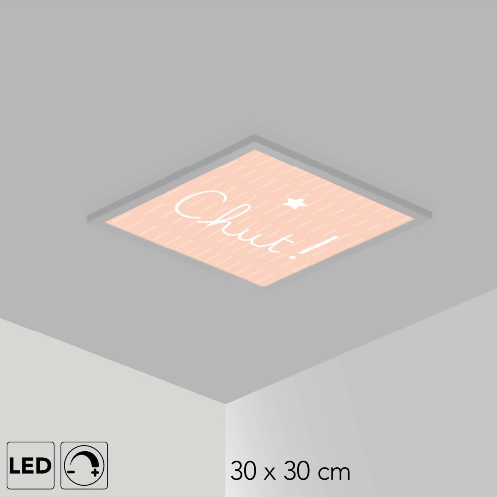 Le plafonnier comprend le panneau LED personnalisé avec le visuel, une alimentation et en option un interrupteur mural-variateur pour régler l’intensité de la lumière dans la chambre de votre enfant.